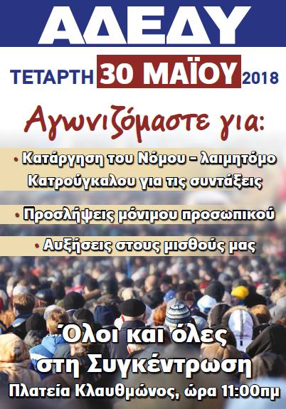 Για όλους αυτούς τους λόγους αποφασίσαμε από κοινού με τους άλλους φορείς να κηρύξουμε 24ωρη Γενική Απεργία για τις 30 ΜΑΗ και πέρα από τα γενικά αιτήματα της ανατροπής της ΛΙΤΟΤΗΤΑΣ, του περιορισμού της ΑΝΕΡΓΙΑΣ, της κατάργησης της ΥΠΕΡΦΟΡΟΛΟΓΗΣΗΣ, διεκδικούμε τα πανδημοσιοϋπαλληλικά αιτήματα: